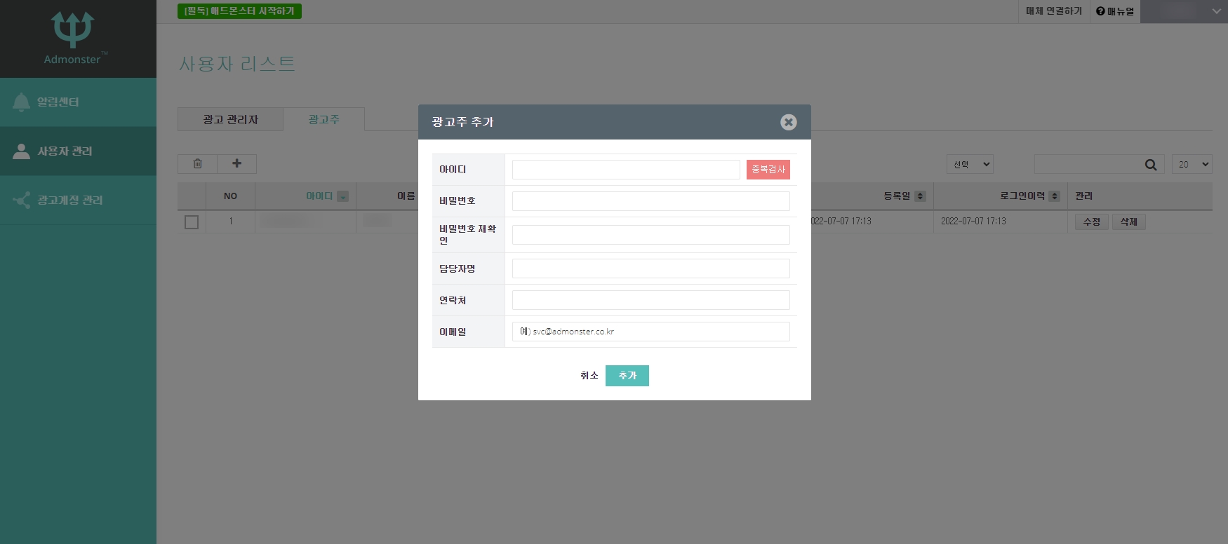 광고주 광고주 계정은 ADMONSTER에서 관리중인 광고 계정을 공유할 때 필요한 계정입니다. 광고주 계정 생성은 선택 사항이며, 광고관리자가 생성할 수 있습니다.