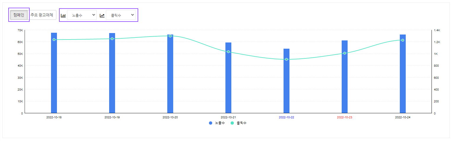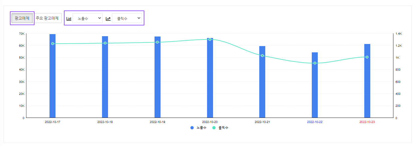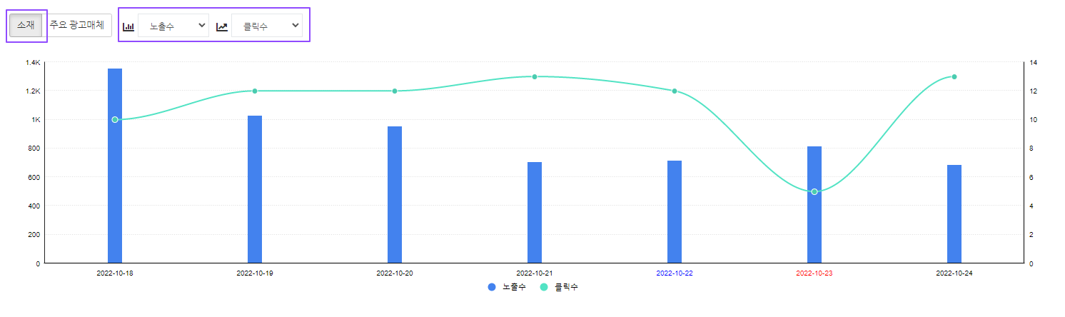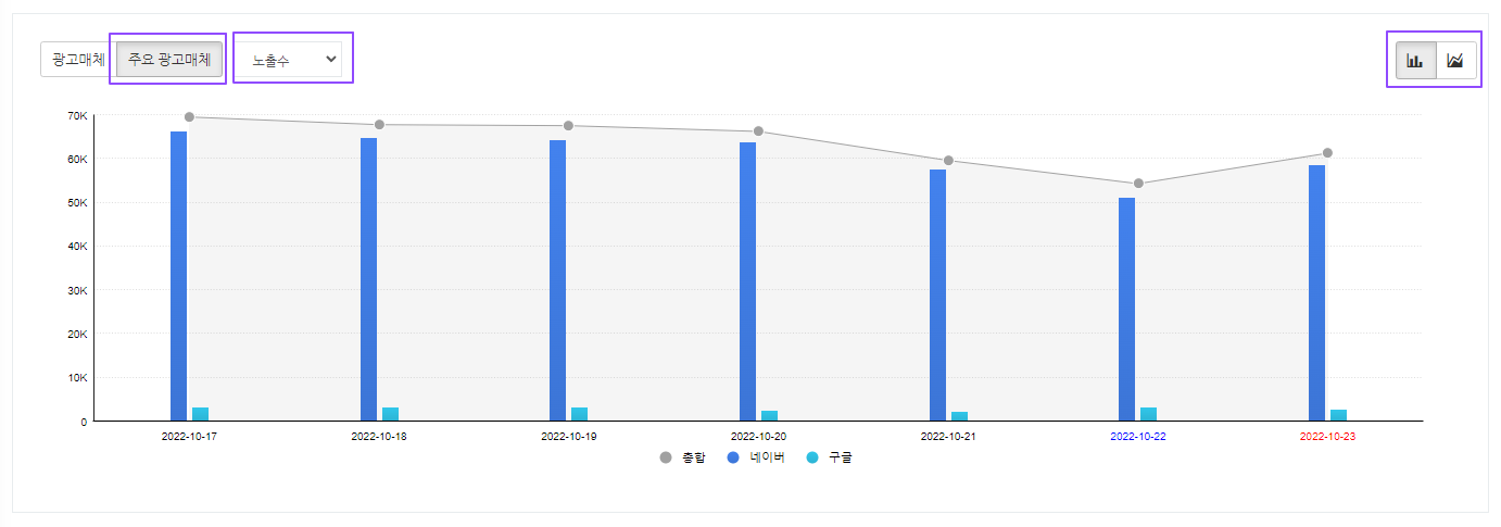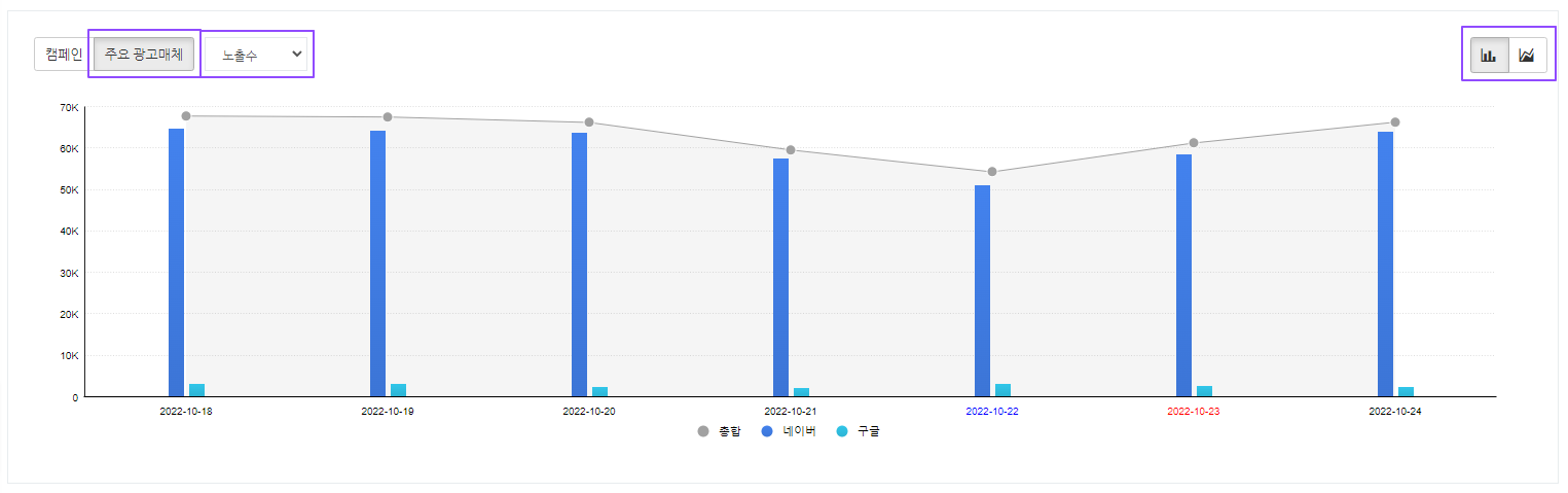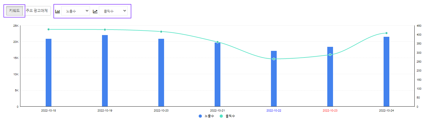 선택한 분석 대상의 기간별 광고 성과를 시각화된 그래프로 한 눈에 비교 분석할 수 있습니다.