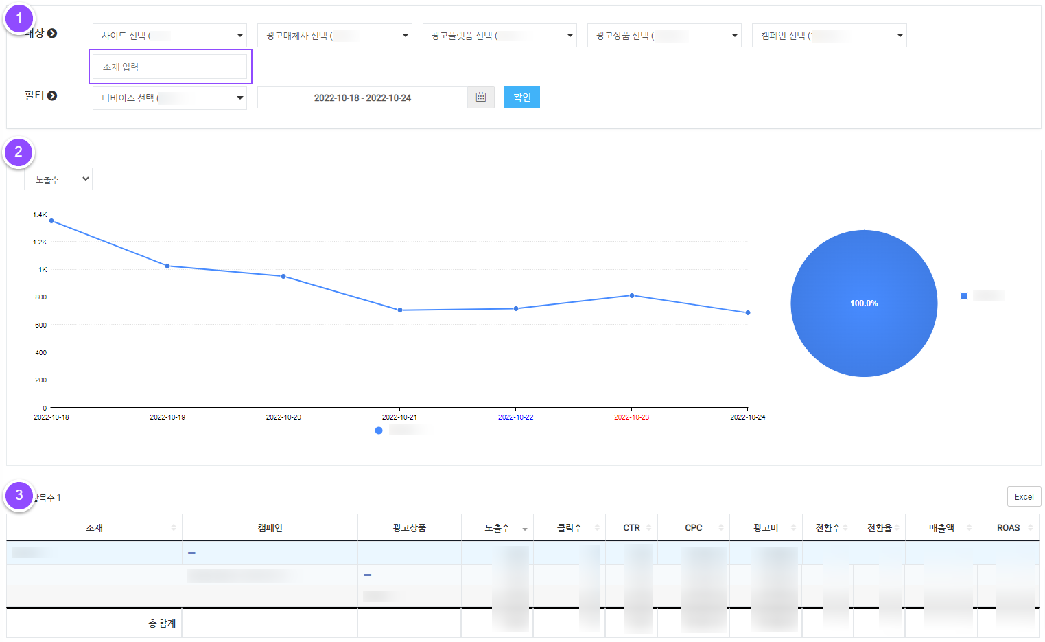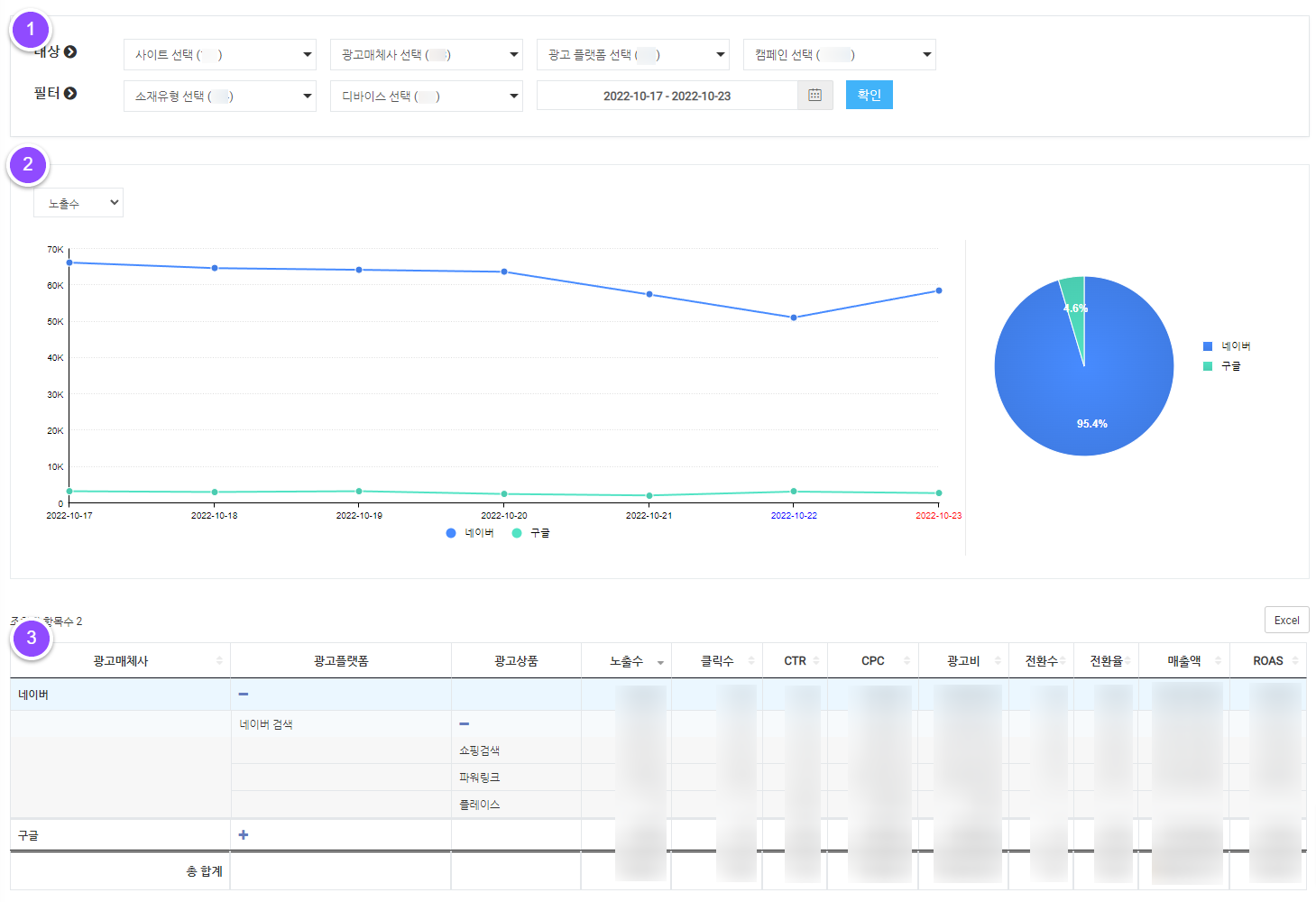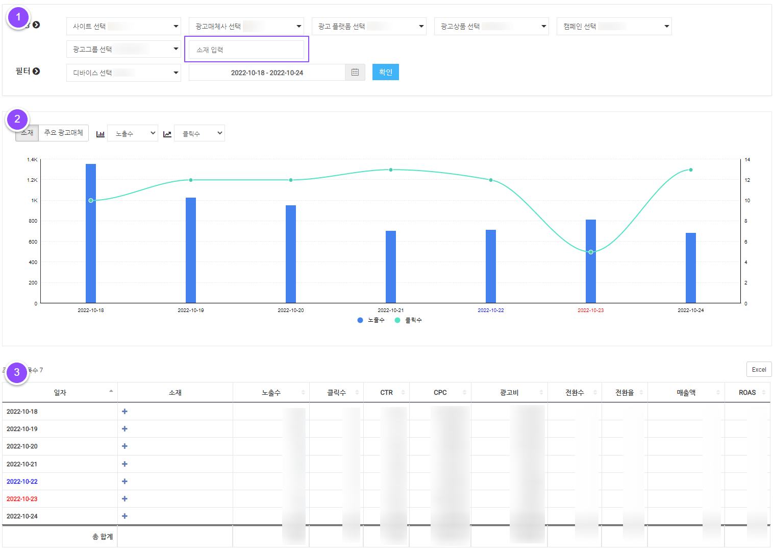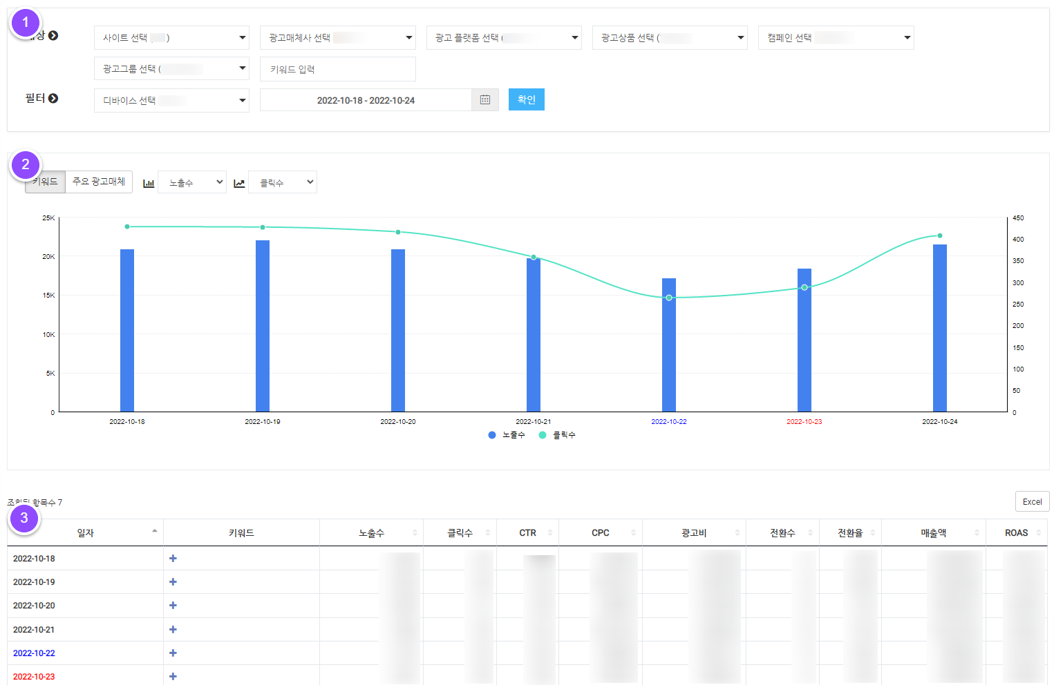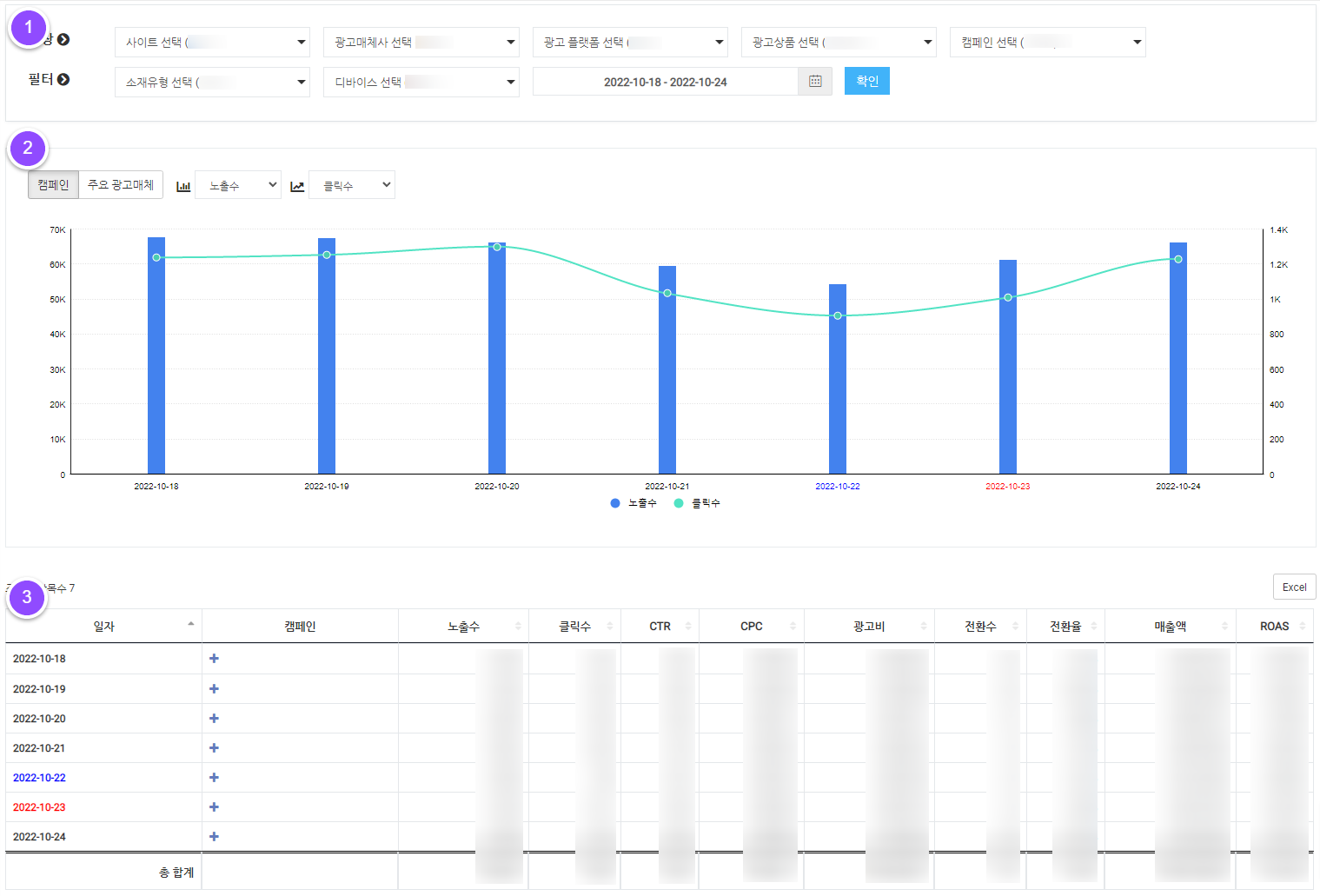 ① 매체/캠페인/광고그룹/광고상품/디바이스 항목을 선택합니다. ② 지표 항목(노출수/클릭수/전환수/광고비/매출액)을 선택합니다. ③ 일간/주간/월간 기간별로 추이를 확인할 수 있습니다.