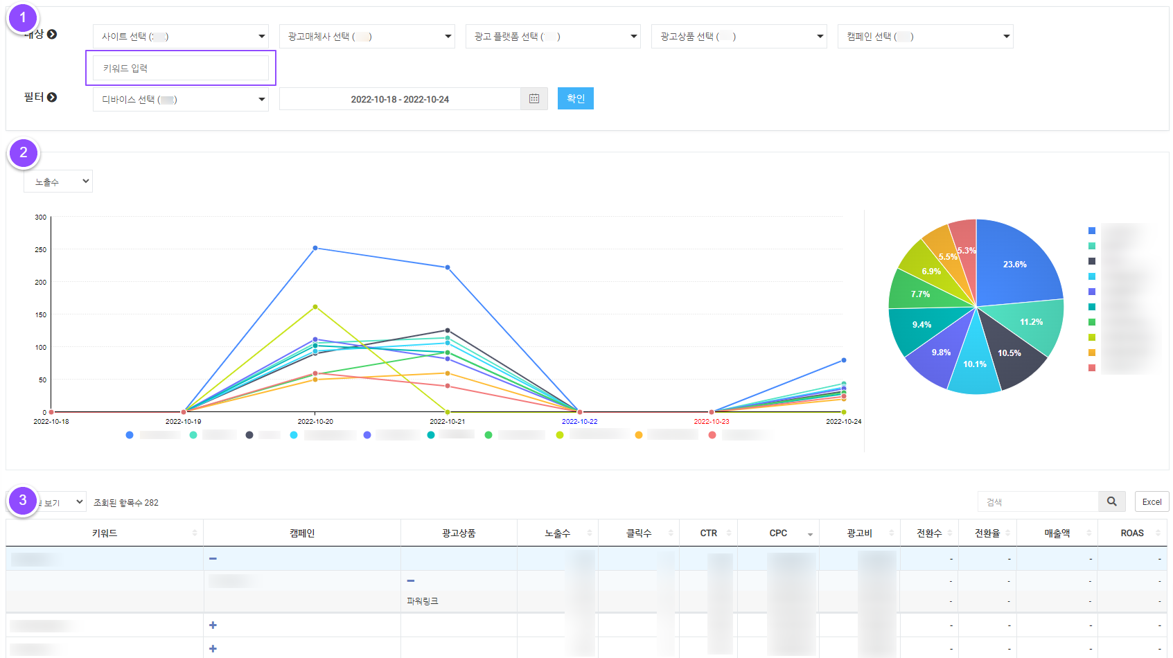 2번의 지표 항목을 클릭하면 노출수/클릭수/광고비/전환수/매출액 중 선택한 지표에 따른 파이 차트가 노출됩니다.