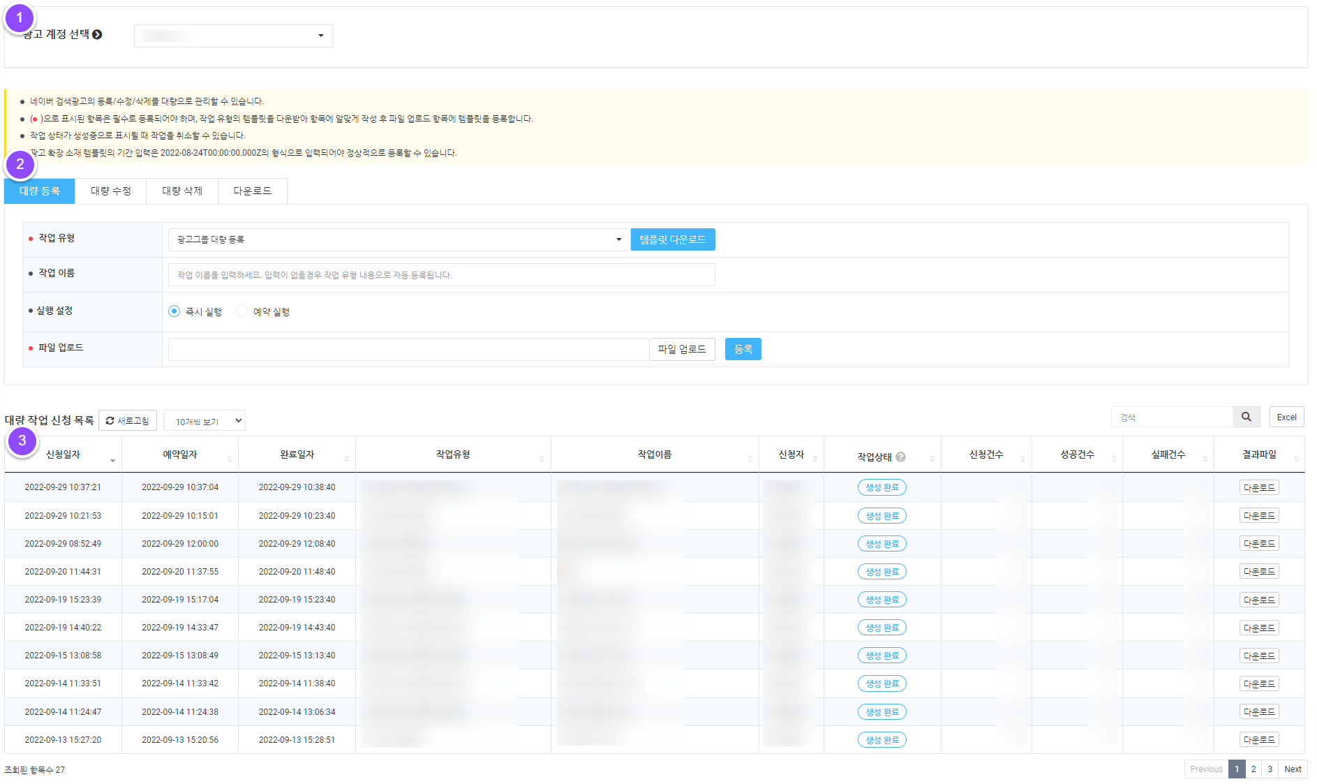 신청건수/성공건수/실패건수 : 대량 작업에 포함된 건수와 성공 실패 여부를 숫자로 나타냅니다.