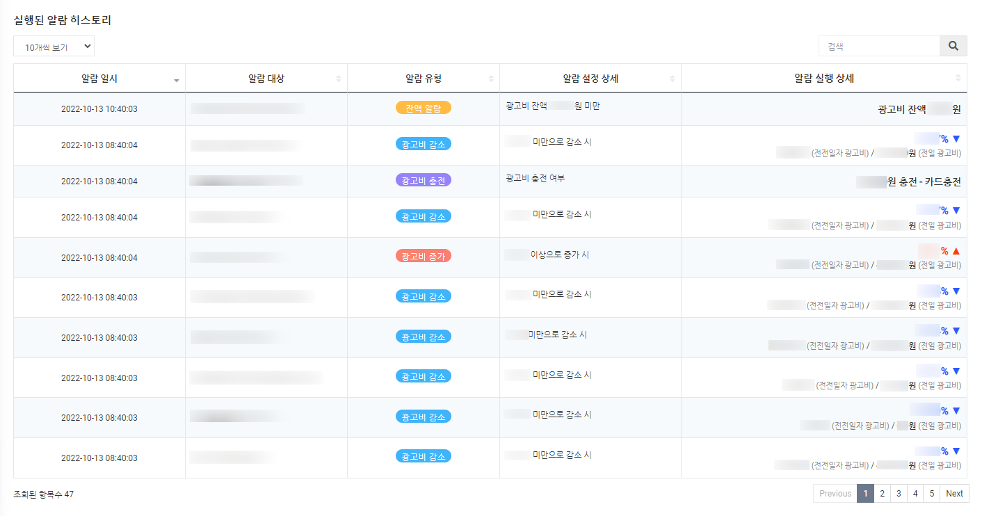 알람 실행 상세 : 설정된 알람 유형에서 실행된 내용을 상세 표기합니다.