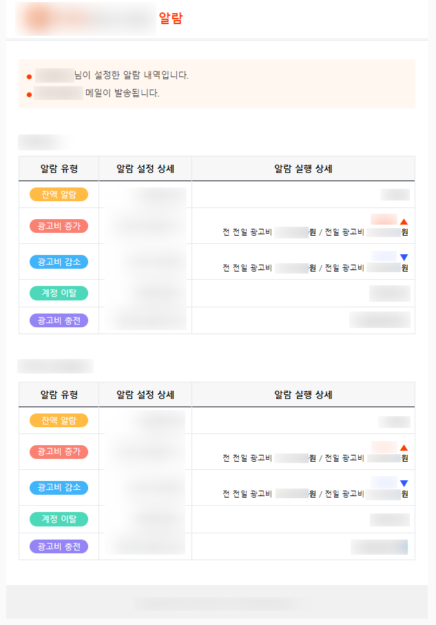 광고비 감소 : 설정한 광고비에서 n% 감소한 경우 알람이 발송됩니다.