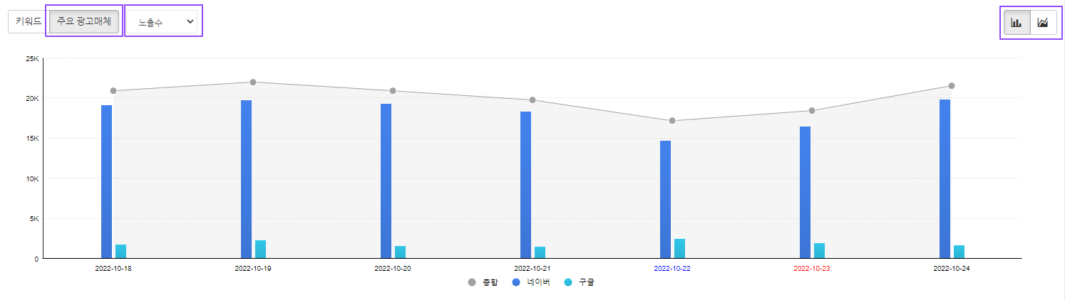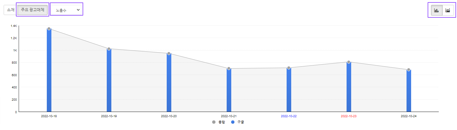 통합 광고 성과의 기간별 추세를 확인할 수 있습니다. 기간 범위 선택 시, 일별/주별/월별과 같은 기간 선택이 가능하며, 성과 추세를 희망하는 광고지표도 선택할 수 있습니다. 기간별 성과 추세를 확인할 수 있으며, 다음 3단계 설정으로 원하는 방식의 분석이 가능합니다.