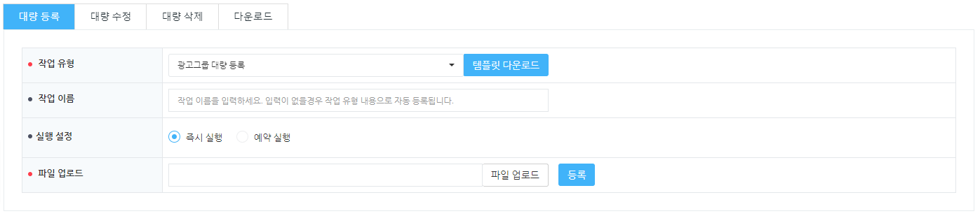 실행 설정 : 즉시/예약 실행 유형을 선택합니다. 예약 실행의 경우 일시를 설정해주세요. 디폴트 : 즉시실행 즉시 : 대량 작업 즉시 실행 예약 : 대량 작업 예약 설정(년/월/일/시/분) * 예약 기간 설정은 이전 날짜 선택 불가