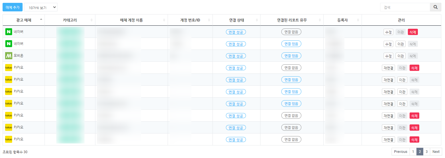 매체 계정 이름: 매체 추가 시 입력한 계정 이름. 입력이 없으면 등록자의 로그인 아이디 표시