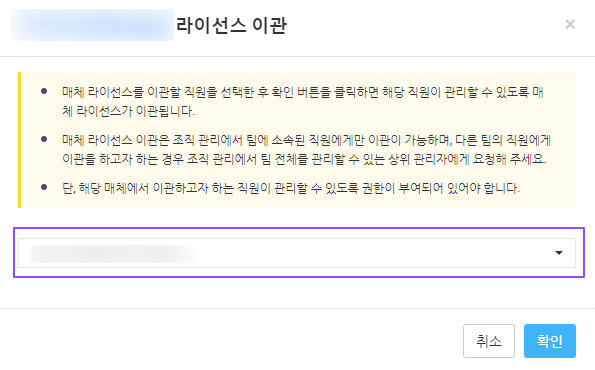 이관: 등록 매체의 라이선스를 다른 직원에게 이관