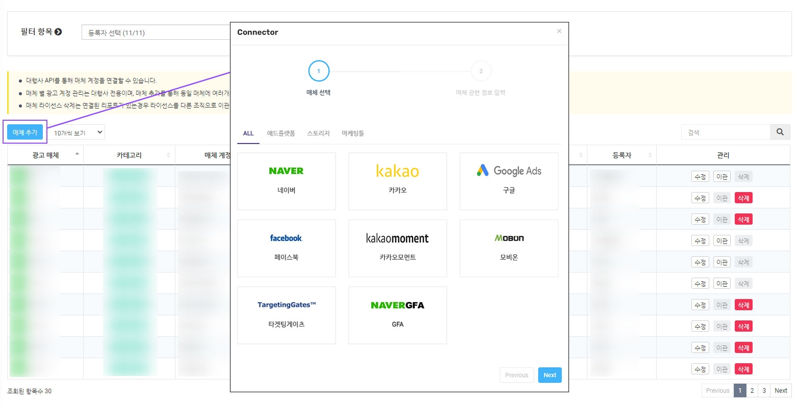 매체별 광고 계정 관리 메뉴의 매체 추가는