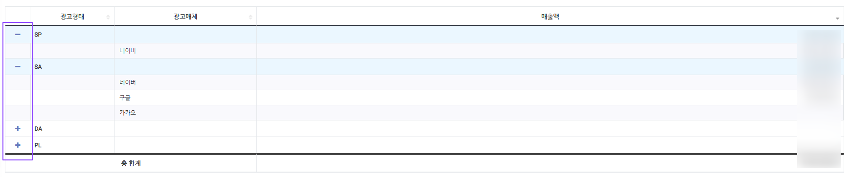 + 버튼을 클릭하면 해당 광고 형태의 광고매체별 상세 매출액을 확인할 수 있습니다.