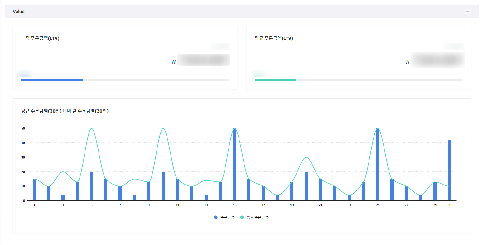 지난 30일간 누적 주문 금액과 평균 주문 금액을 확인할 수 있습니다.