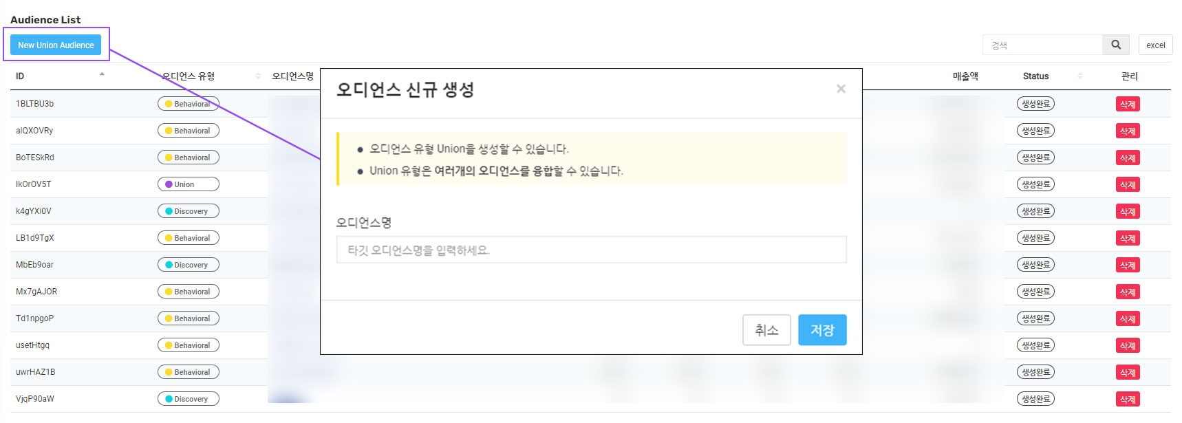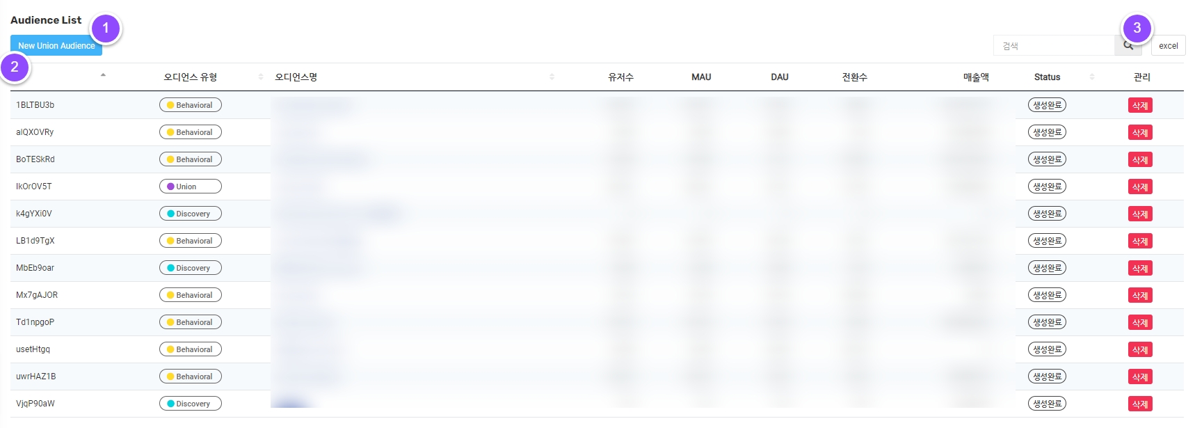 관리 : 생성한 오디언스를 삭제할 수 있습니다.