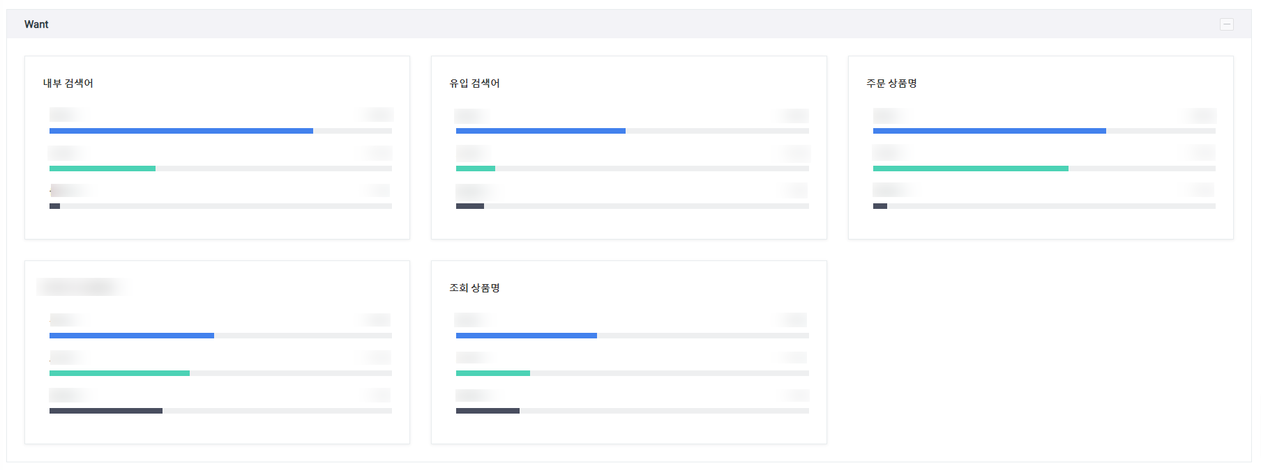 내부 검색어, 유입 검색어, 주문 상품명, 장바구니 상품명, 조회 상품명 등