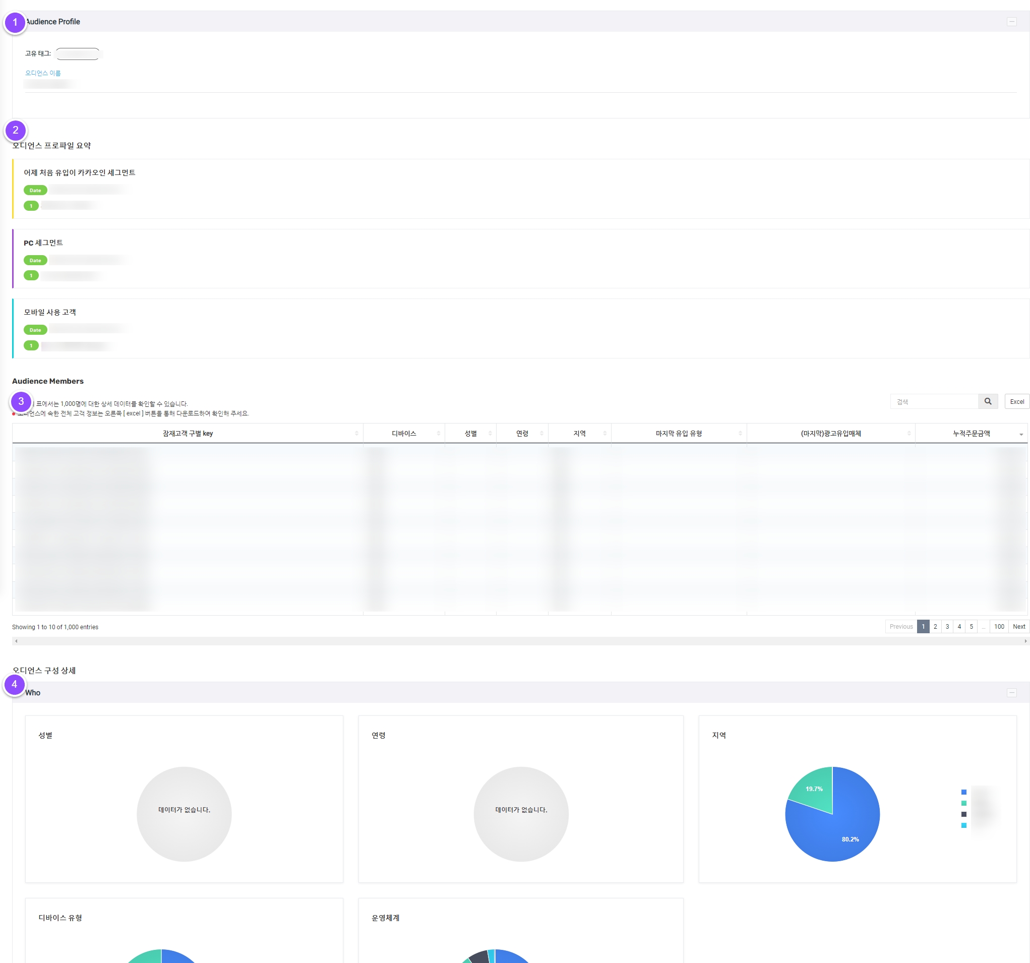 오디언스 명 : 생성된 오디언스의 상세 페이지를 조회할 수 있습니다.