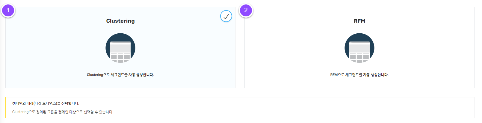 5-1. 데이터 항목 선택 : 특정 기준을 이용하여 동일한 성향을 가진 유저를 모은 군집으로, 1단계에서 한 가지 항목을 선택합니다.