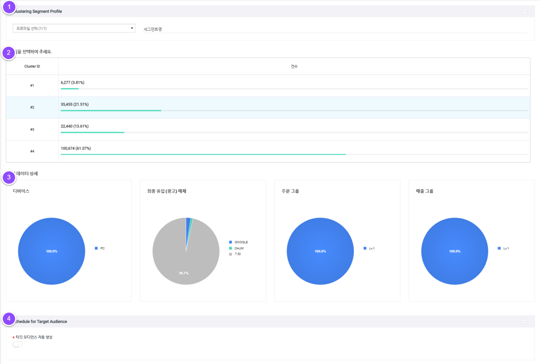 해당 군집의 디바이스/최종 유입(광고) 매체/주문 그룹/매출 그룹 상세 데이터를 확인할 수 있습니다.