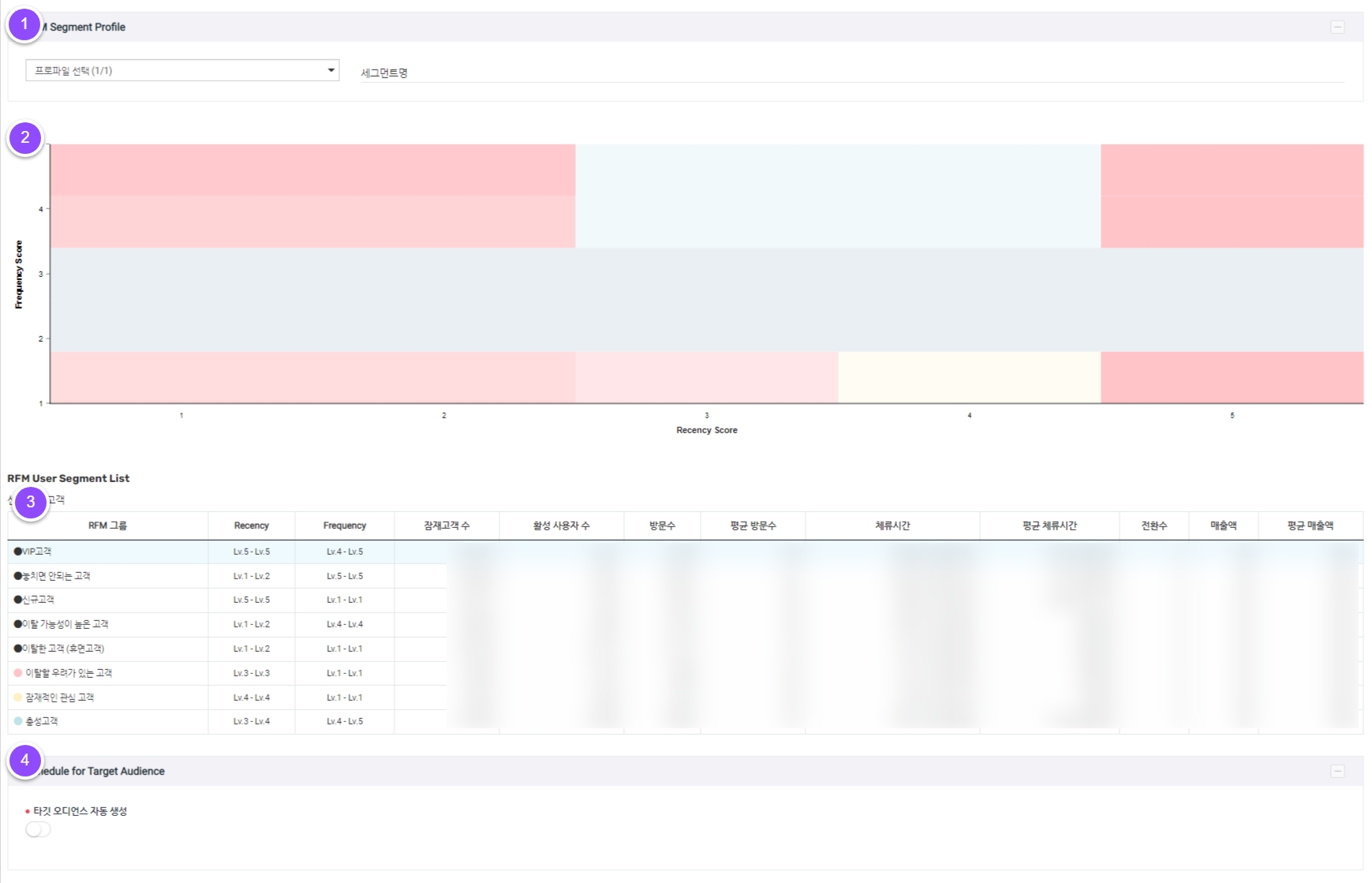 최근성(Recency), 빈도(Frequency) 데이터를 활용하여 잠재고객을 자동 그룹핑합니다.